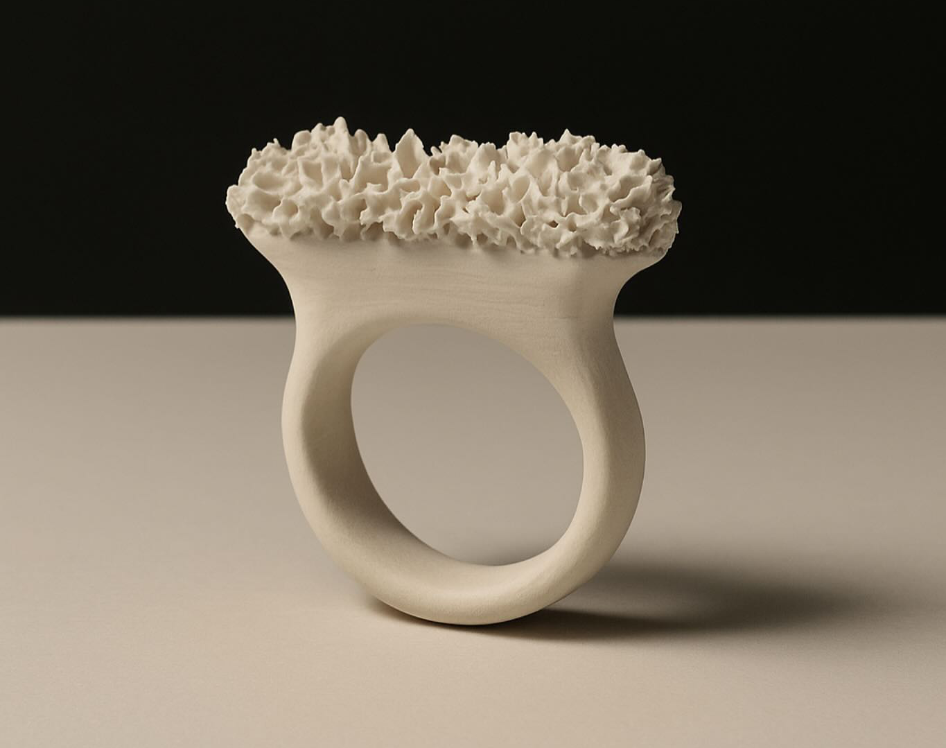 Their forms are often taller and more sculptural than what one would normally expect from a ring. At first glance, the material appears delicate and sensitive, almost fragile — yet it is surprisingly strong and durable. This is the unique duality of porcelain: behind its apparent fragility lies a quiet strength and a distinct presence when worn.