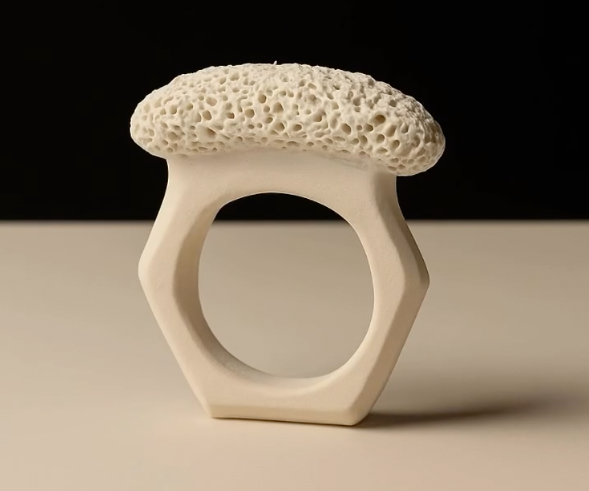 The AGNÉSSE porcelain rings are born as miniature sculptures for the hands. Each piece is made of individually shaped porcelain, created as a work that goes beyond the traditional concept of jewelry.