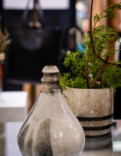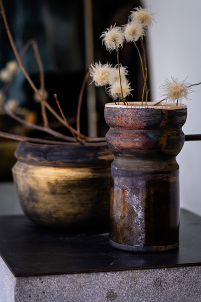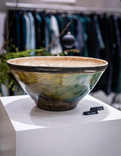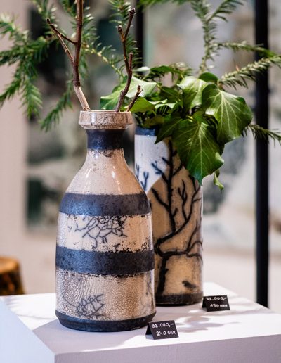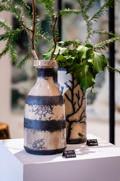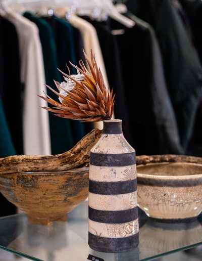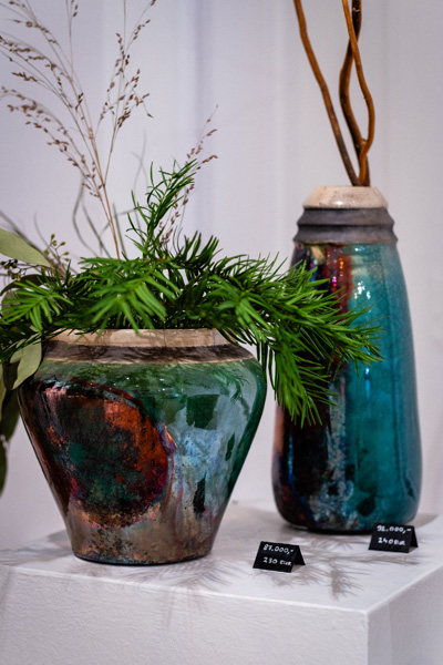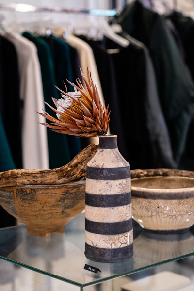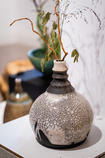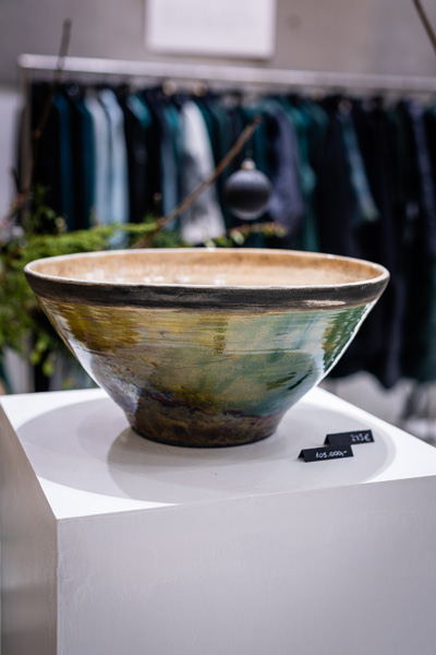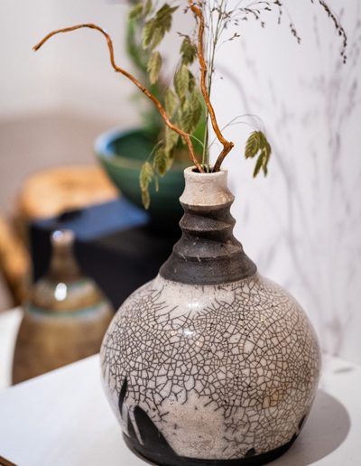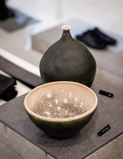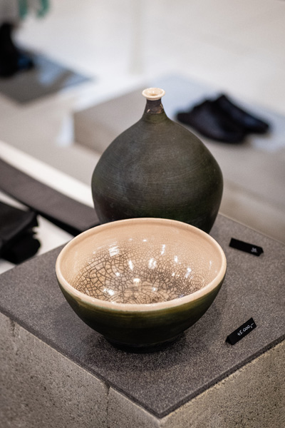 Soltész Ágnes munkái ebben a közegben különösen hangsúlyosan érvényesültek. A raku kerámiák felületén megjelenő repedések, rétegek és finom elszíneződések a természetes folyamatok nyomait hordozzák magukon – olyan értékeket, amelyek szorosan kapcsolódnak a NUBU tervezői szemléletéhez. Az anyag kiszámíthatatlansága és az égetés során kialakuló egyszeri formák párbeszédbe léptek a kollekció strukturált textíliáival, megerősítve a limitált, megismételhetetlen alkotás gondolatát.